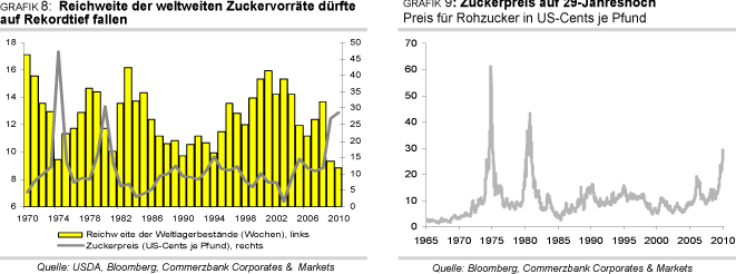 Schätzungen des weltgrößten Zuckerhändlers Czarnikow zufolge könnte das Defizit am weltweiten Zuckermarkt im Erntejahr 2009/10 auf 13,5 Mio. Tonnen anschwellen. Trotz des bereits kräftigen Anstiegs sollte der Zuckerpreis in den kommenden Monaten daher weiter zulegen. Unter Umständen kann er sogar das Niveau von 1980 erreichen, als in der Spitze mehr als 40 US-Cents je Pfund bezahlt wurden (Grafik 9). Für das zweite Halbjahr, spätestens jedoch im Jahr 2011, rechnen wir dann allerdings mit einem scharfen Preisrückgang in Richtung 20 USCents, weil das Angebot aufgrund des Preisanstiegs deutlich ausgeweitet werden dürfte und der Nachfrageanstieg durch das hohe Preisniveau gedämpft wird................."