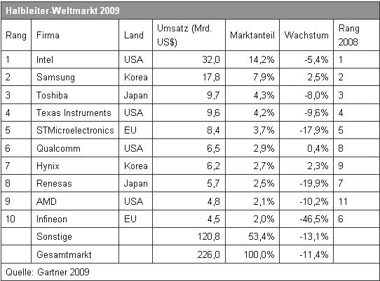 Mit dem Ausbruch der Wirtschaftskrise wies bereits das Jahr 2008 ein Minus von 4,4 Prozent auf. Den größten Rückgang beim Umsatz musste die Branche im ersten Quartal 2009 verkraften. Von da an ging es quartalsweise wieder etwas bergauf. Laut Gartner-Analyst Stephan Ohr bekam die Erholung als erstes die PC-Industrie zu spüren, später folgten dann die verbrauchernäheren Branchen wie Handys oder Autos.Intel verteidigte seinen Spitzenplatz unter den Halbleiterschwergewichten trotz eines Umsatzminus von 5,4 Prozent. Auf Platz zwei folgte der südkoreanische Chipkonzern Samsung Electronics , der sogar ein Plus von 2,5 Prozent verbuchen konnte. Zuwächse gab es auch bei Hynix (-2,3%) und Qualcomm (+0,4%). Die deutlichsten Umsatzeinbrüche musste hingegen Infineon Technologies verkraften. Bei dem Münchener Konzern sank der Umsatz um 46,5 Prozent./