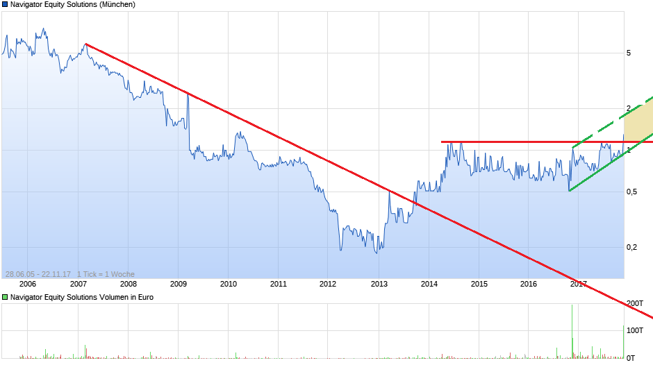 Navigator habe ich erst letzte Woche hier im Blog ausführlicher vorgestellt und der Kurs ging ab wie eine Rakete. Die gut 31% sind aber wohl nur in begrenztem Umfang auf meine Einschätzung zurückzuführen, denn dann hätte der Kurs - wie in den vergangenen drei Jahren öfter schon - auf dieses kurzzeitige Strohfeuer entsprechend reagieren und die Gewinne wieder weitgehend abgeben müssen. Dem war/ist aber nicht so und der Kurs war die ganze Woche über stark. Er hat sogar seine dreijährige Konsolidierungsphase beendet und ist nach oben ausgebrochen. Ich vermute, dass mein Artikel nur ein Mosaiksteinchen war neben der erfolgreich verlaufenen Analystenpräsentation und der außerordentlichen Hauptversammlung bei der 75%-Tochter IT Competence Group, die die Sitzverlegung nach Deutschland beschlossen hat. Darüber hinaus dürfte es operativ nach dem enttäuschenden Jahr 2016 wieder besser laufen. Aber auch die Beteiligung PEH Wertpapier konnte mit hervorragenden 9-Monatszahlen glänzen und die neue Beteiligung Solvesta wird sich auf der Münchner Kapitalmarkt Konferenz vorstellen. Hier sind in den nächsten Wochen und Monaten also interessante News zu erwarten, die insgesamt das Interesse auch an der Navigator Equity hoch halten sollten. Naja, zumindest höher als bisher... Und so besteht die Aussicht, das sich der weiterhin große Abschlag auf den NAV, der oberhalb von 2 Euro zu veranschlagen ist, sich tendenziell weiter abbaut. Denn Erfolge und Kurssteigerungen bei den Beteiligungen der NES, wie ITC, PEH Wertpapier, Solvesta, Pech Property Group werden den NAV der NES selbst ja auch (positiv) beeinflussen und den Discount wieder erhöhen. Sofern der NES-Kurs nicht nachzieht, wovon ich aber ausgehe.