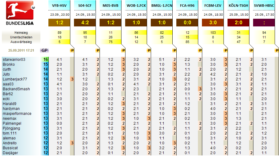 Nur noch Bronko hat ne Chance bei Sieg Bremen mit Ergebnistreffer gleichzuziehen, bzw. aaa03 und Palmengel brauchen ein 1:1 zw. Bremen und Berlin.. und tom.111 - da müßte Berlin gewinnen...