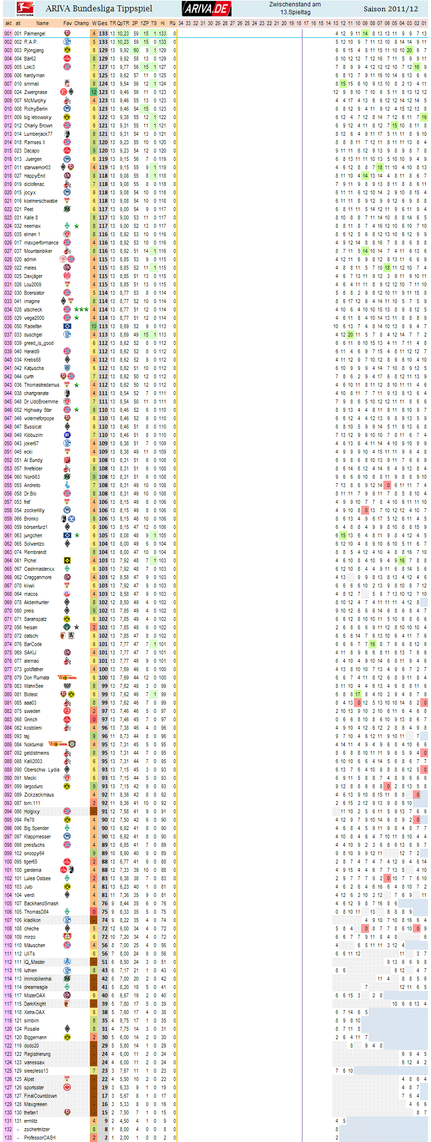 Palmengel wieder vor R.A.P.!! Allerdings auch nur aufgrund des einen Tagessieges.. Denn beide sind punktgleich, mit je 133 Punkten..