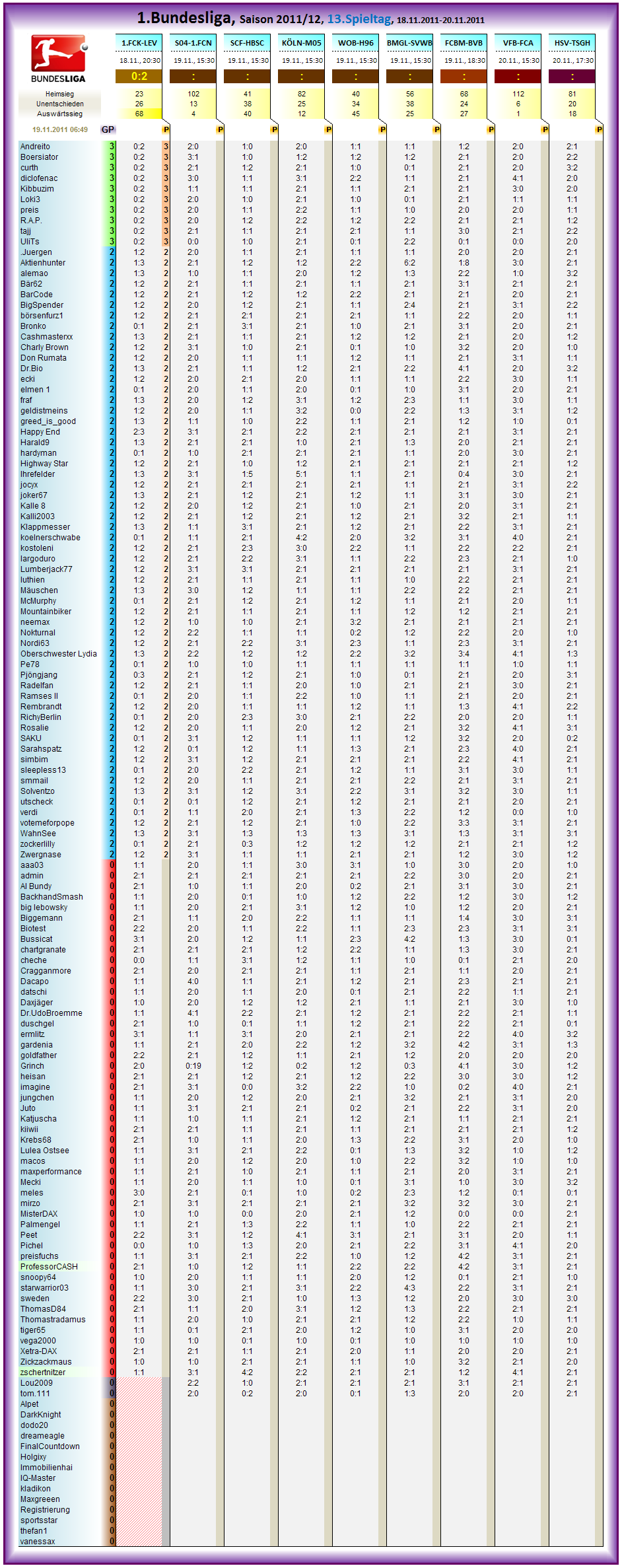 Komplette Gesamtwertung dann wie immer nach dem Topspiel des heutigen Samstages FCBM-BVB..