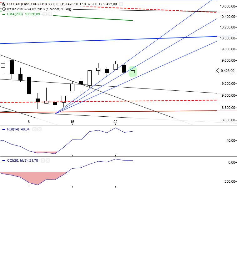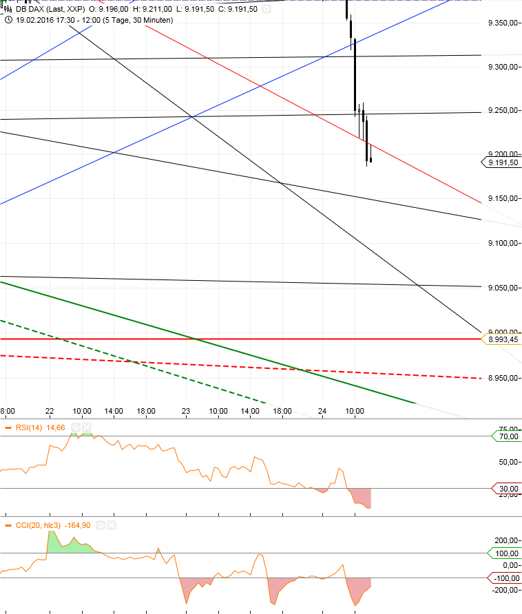 Der Dax ist doch noch gefallen bis zur unteren blauen Fibo-Fächerlinie. Kommt jetzt die Erholung bis zum Ausbruch?