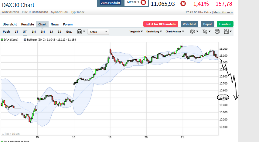 Wegen der Taxierung der Indizies in der vergangegen Nacht hatte ich schon anmir und noch mehr an den Marktkräften gezweifelt. Meine Short-Position im Dax ist jetzt endlich wieder im Plus. Am Kursziel 10500-10600, welches ich seit Tagen favorisiere solange die 11300 nicht überschritten werden, halte ich weiterhin fest. Wenn notwendig nehme ich die Position auch in die nächste Woche rüber.