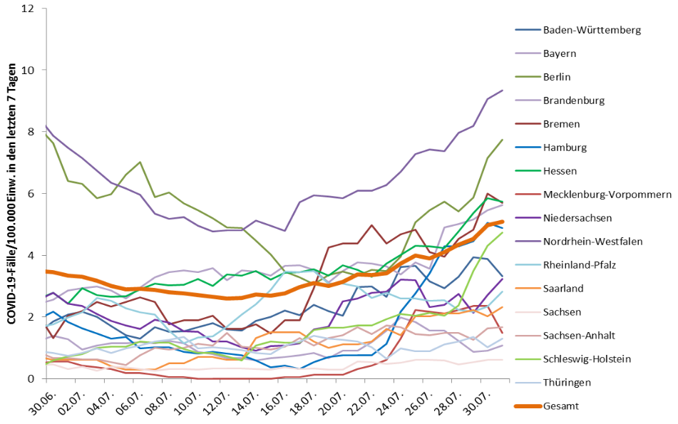 Die Inzidenz beträgt heute bei 7,7, Wenn das so weitergeht, wird Berlin bei der Neuinfektionsdichte bald vor NRW (heute 9,3) liegen.