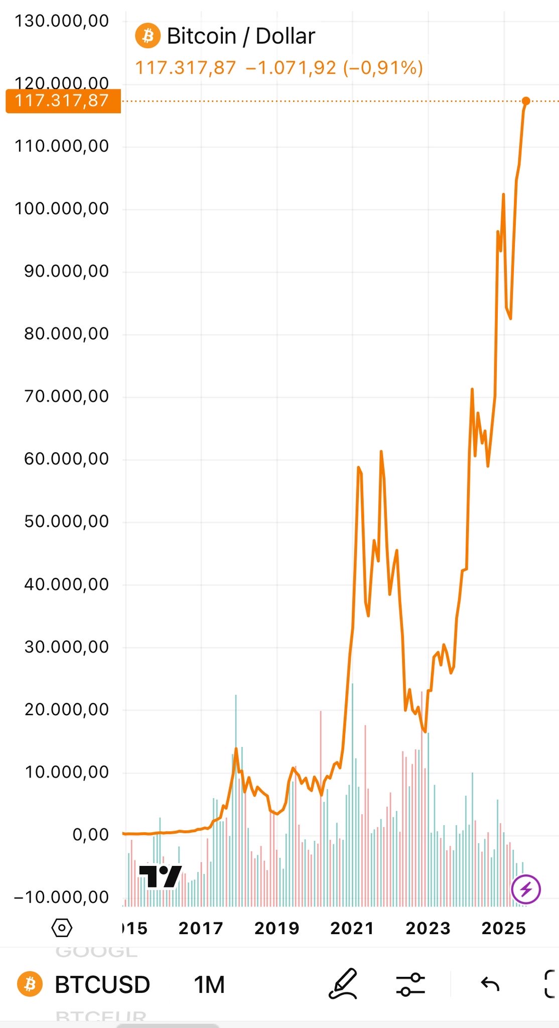 kommt der Kurs (in Euro) nicht recht vom Fleck. Die ATH in Dollar sind dem Wertverfall dieser Währung unter den Eskapaden der irren Orange geschuldet und wenig relevant.