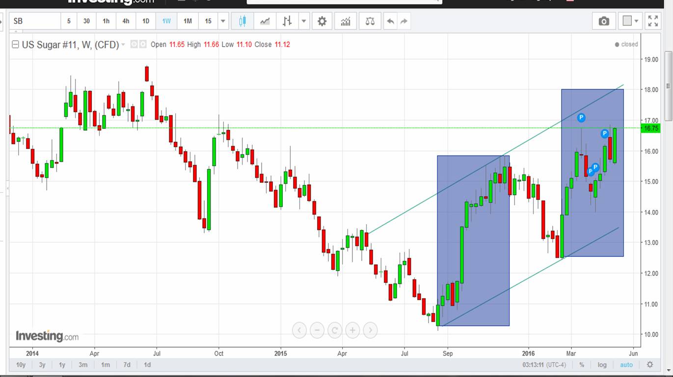 Ein Doppeltop taucht meistens auf am Ende eines langen Aufwärtstrends. Hier bei Zucker baut sich der Trend erst gerade auf. Außerdem erkennt man einen Doppeltop erst wenn der letzte Tief unterschritten wird. Jetzt ist es viel zu früh, um einen Doppeltop zu prognostizieren. Ich sehe eher die Möglichkeit, dass der Zuckerpreis auf 18 ct. steigt.