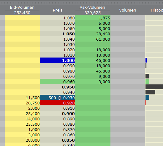 Danach brutal zurückgeführt, zuletzt mit 500 Stücken zu 0,93...tief im Minus!