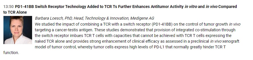 Die Präsentation mit dem Titel "PD1-41BB Switch Receptor Technology Added to TCR-Ts Further Enhanced Antitumor Activity in vitro and in vivo compared to TCR alone" wird nach der Konferenz auf der Website von Medigene verfügbar sein: https://medigene.de/wissenschaft/abstracts/