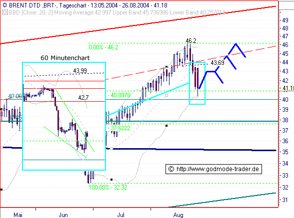 Der Brent Öl Future im Endloskontrakt hat heute das Mindest-Konsolidierungsziel von 40,9 erreicht. Das Tagestief liegt bei 40,36. Damit wurde auch das Optimal-Konsolidierungsziel von 40,0 fast erreicht. Im 60 Minutenchart "bullkeilt" der Future aber gefährlich. Insofern würden wir dringend Shortpositionen glattstellen. Ausgehend von dem 40,0er Bereich bahnt sich eine Gegenreaktion bis 42,7-43,0 an, wobei sich dort dann die weitere Ausrichtung entscheiden wird. Über 43,0 auf Tagesschluß dürfte es bis 45,0 und 46,2 $ gehen.