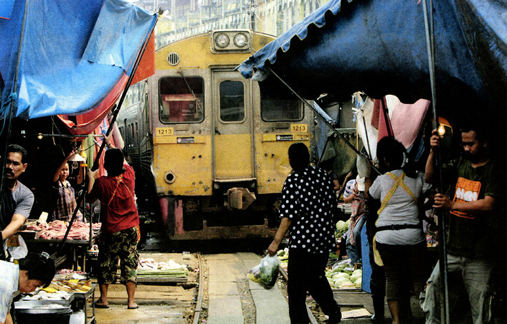 „Im Zug stehen“ hat bei Händlern der thailändischen Stadt Maekrong eine ganz eigenen Bedeutung. Achtmal am Tag müssen sie ihre Verkaufsstände zurückbauen, damit Züge die enge Strecke passieren können. Was dem Platz den Namen „Railroad Market“ eingebracht hat – und Händlern jede Menge Arbeit, den Pendlern tägliche Verspätungen.