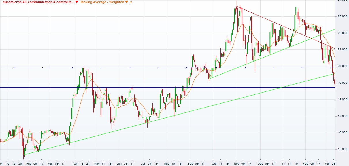 meiner Meinung nach hat sich charttechnisch in den letzen Wochen ein sehr großes Dreieck gebildet (Ein Bild hab ich grade leider nicht) welches am Montag endlich verlassen wurde. Ich hatte eigentlich auch erwartet, dass dieses Dreieck nach oben verlassen werden würde weil es bei Euromicron eigentlich nur nach oben gehen kann. Der Ausbruch nach unten ist vermutlich erfolgt weil es seit ewigkeiten keine Nachrichten, weder positive noch negative, gegeben hat und da wurde es jetzt manchen zu bunt.