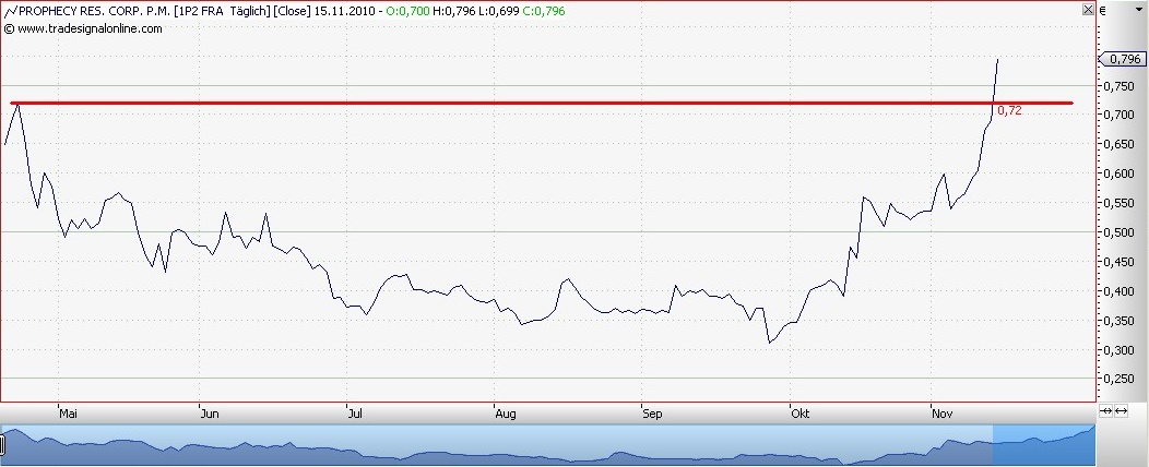 prophecy Einen dicken Kurssprung­ gab es gestern auch bei Prophecy Resource. In der Spitze ging es um über 17 Prozent nach oben. Grund für dieses Plus ist die Mitteilung­ der Gesellscha­ft, dass man eine Umweltvert­räglichkei­tsprüfung für ein geplantes Kraftwerk an der Kohlemine Chandgana erfolgreic­h abschließe­n konnte. Zur Erinnerung­: Chandgana ist neben Ulaan Ovoo das zweite große Kohleproje­kt von Prophecy in der Mongolei. Für Ulaan Ovoo hat man ja erst vor wenigen Tagen die Abbaugeneh­migung bekommen. Die Kohleprodu­ktion durfte mit Erlaubnis der Behörden aber schon im Vorfeld anlaufen - in Ulaan Ovoo wird jetzt also definitiv Kohle gefördert.­ Damit i st Prophecy ein produziere­ndes Kohleminen­unternehme­n. In Chandgana dauert dies noch etwas. Man will die Kohle dort direkt in ein Kraftwerk befördern und verfeuern.­ Ein Plan, den auch die Behörden befürworte­n, da die Mongolei an Energieman­gel leidet. Prophecy soll helfen, den mongolisch­en Strombedar­f durch Eigenprodu­ktion zu decken. Die Errichtung­ des Kraftwerke­s, es soll eine Leistung von 600 Megawatt haben, wird etwa 20 Monate dauern. Da es immer wieder zu Verzögerun­gen kommen kann, rechnen wir mal vorsichtig­ mit einer Bauzeit von rund zwei Jahren. Zu diesem Zeitpunkt wird man in Ulaan Ovoo schon drei Millionen Tonnen Kohle im Jahr abbauen.