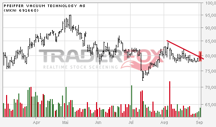 Die Aktie von Pfiffer Vacuum erreichte am 07. Mai 2012 ein Hoch bei 95,00 Euro und geriet danach stark unter Druck. Bis auf ein Tief bei 77,13 Euro fiel der Wert zunächst ab, konnte sich dann aber wieder erholen. Jedoch fiel er am 28. Juni unter den kurzfristigen Aufwärtstrend, womit sich ein weiteres Verkaufssignal ergab. Dies zeigte zwar bisher kaum Wirkung, ist aber weiterhin gültig. Daher droht noch immer ein Rückfall in Richtung 75,52 Euro, außer der Aktie gelingt ein Anstieg per Tagesschlusskurs über 83,13 Euro.