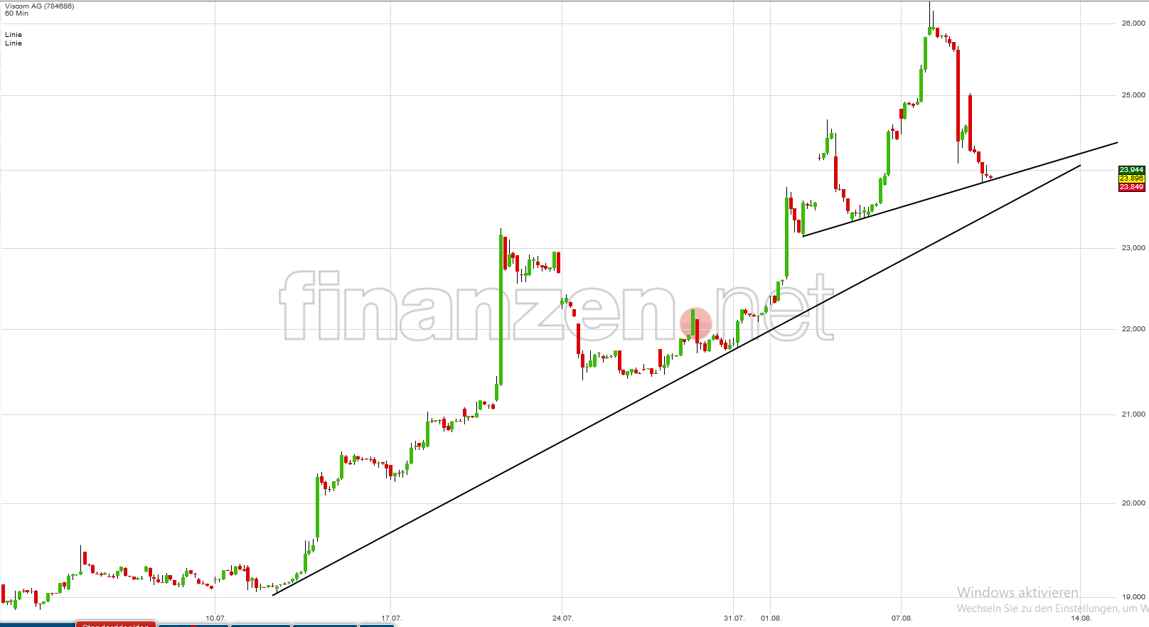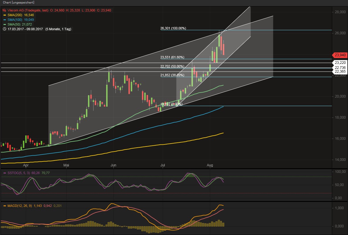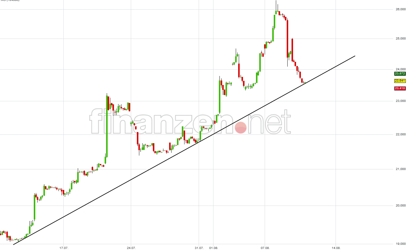 war es eigentlich zu erwarten, dass es einen Rücksetzer geben wird und ich vermute, dass der steile Trendkanal in den nächsten paar Stunden/Tagen aufgegeben wird. Technisch gesehen sind wir in einen Kreuzwiderstand gelaufen, hatte mich daher auch bei 25,55 abgesichert und bin raus geflogen. Von der Untergrenze des breiteren Trendkanals sind wir weit entfernt.
