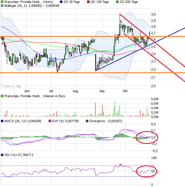 Ich hatte mich zwar gewundert, dass man nochmal unter 2,62-2,65 gefallen war, aber die 100+200 TageLinie haben dann dort bei 2,55 gestützt und nun ist man nach den hohen Umsätzen an manchen Tagen wieder über den Bereich ausgebrochen, zudem auch über den kurzfristigen Abwärtstrend, das mittlere Bollinger und die 38TageLinie. Dazu auch noch Kaufsignale beim RSI und beim MACD leicht angedeutet.