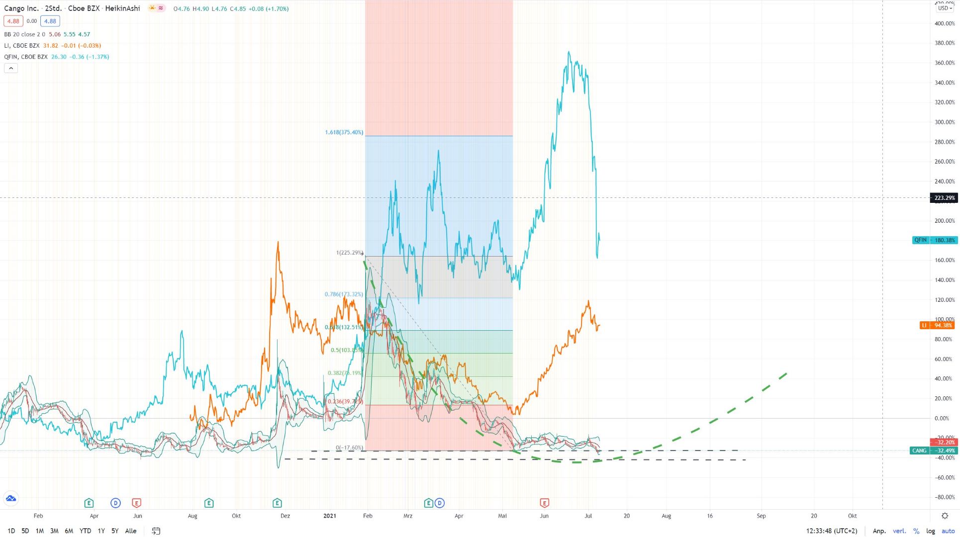 Die beiden Vergleichscharts sind von LI Auto und von 360 digitech, ebenfalls einem Fintech. Rationelle Gründe für Cangos Schwäche sind mir nicht bekannt, daher kann man nur rumspekulieren, was sich dahinter verbirgt.