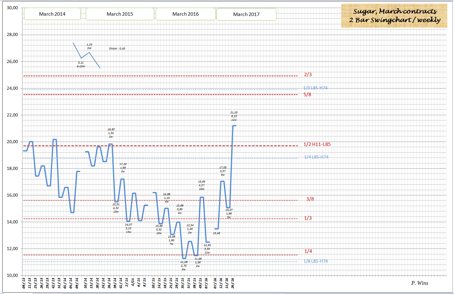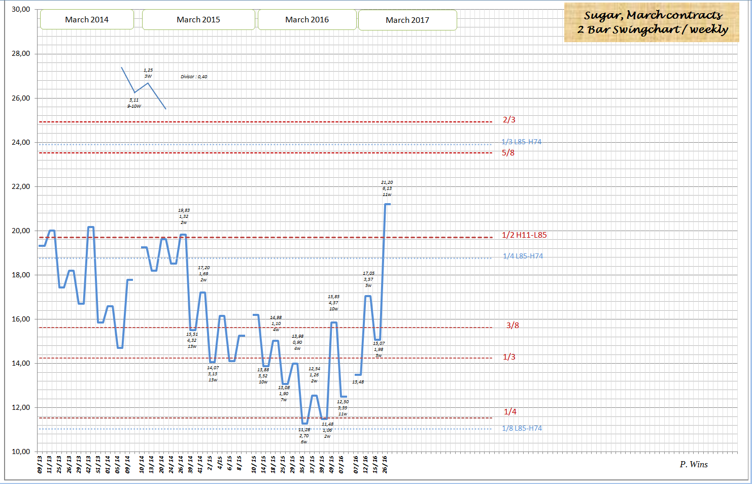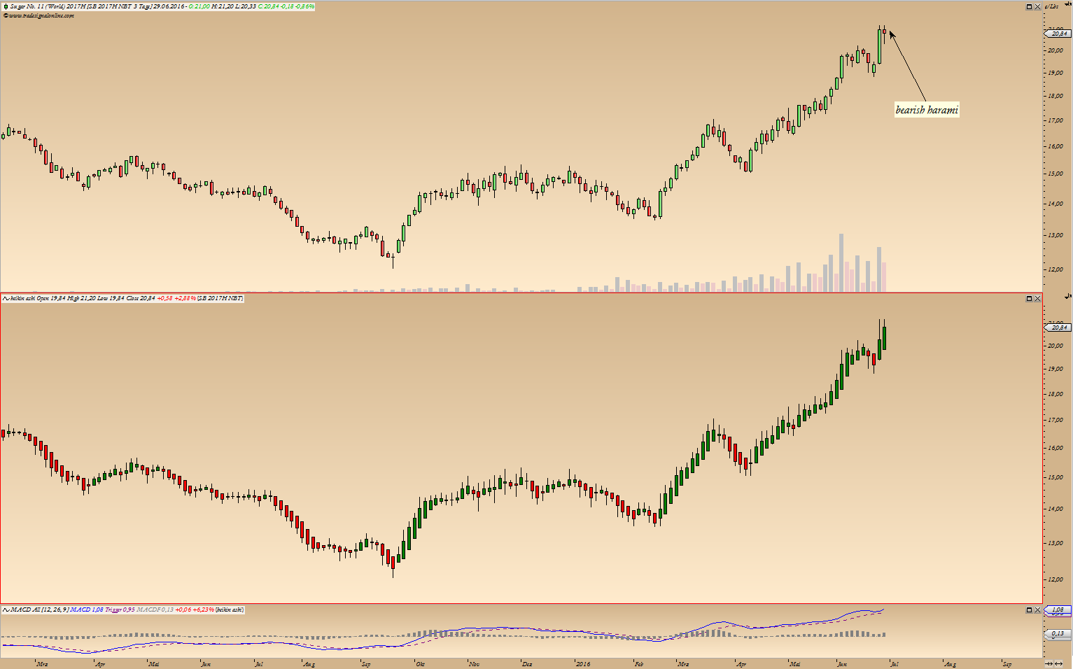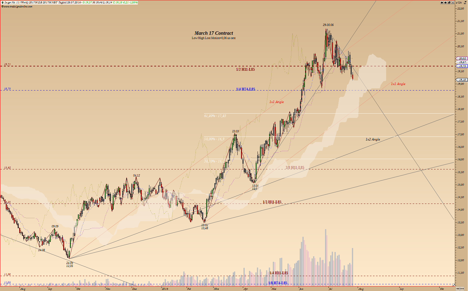 Wie ich schon in 2015 bzw. Anfang 2016 geschrieben habe wird es im Zuge des Aufstieges wichtig sein, wie sich Zuckerpreis an der 1/2 Gann Linie verhällt.