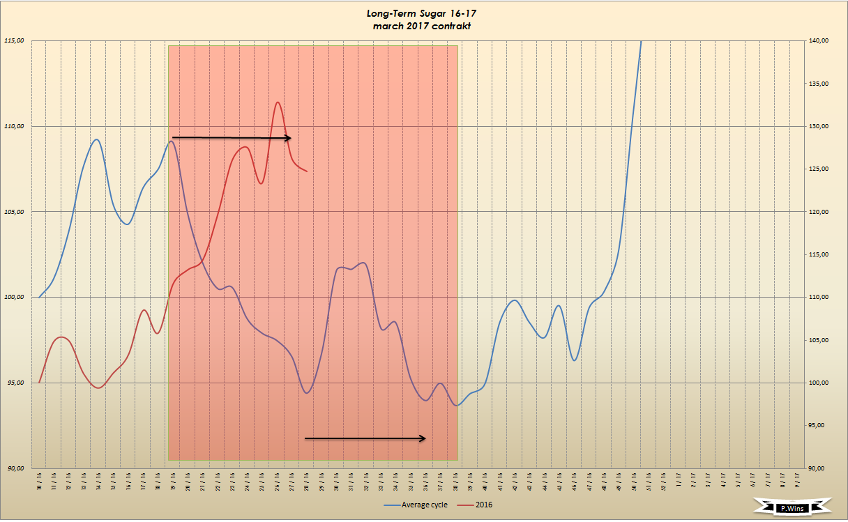 Lt. Swingchart dauerte Aufwärtswing 11 Wochen, bis 26 Kalenderwoche. Mittelswing bei Zucker ca. 10 Wochen in Trendrichtung. Jetzt folgt die Korrektur, die nach Mittelswing mind. 3 Wochen betragen kann.