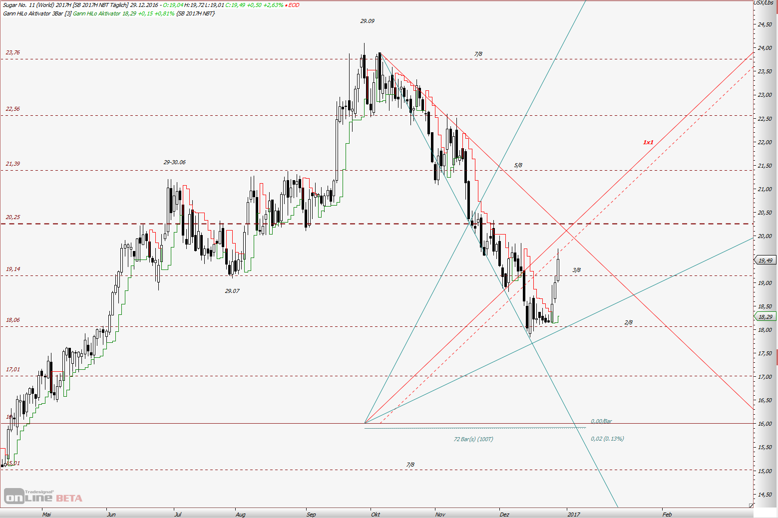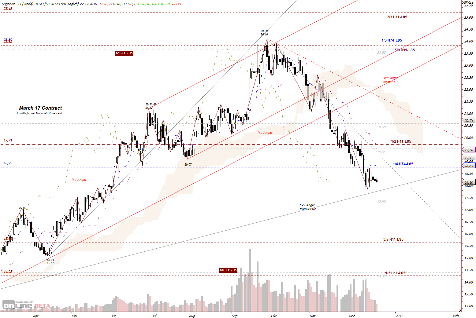 meine Meinung zum Zucker hat sich nicht geändert. Bis jetzt ist Preis, mit kleineren Abweichungen, dem Zyklusverlauf gefolgt und daher gehe ich davon aus, dass es so weiter gehen wird - aufwärts. Wie weit noch nach unten gehen könnte, mag ich nicht sagen. Ich persönlich warte noch auf Kaufsignale bevor ich aktiv werde.