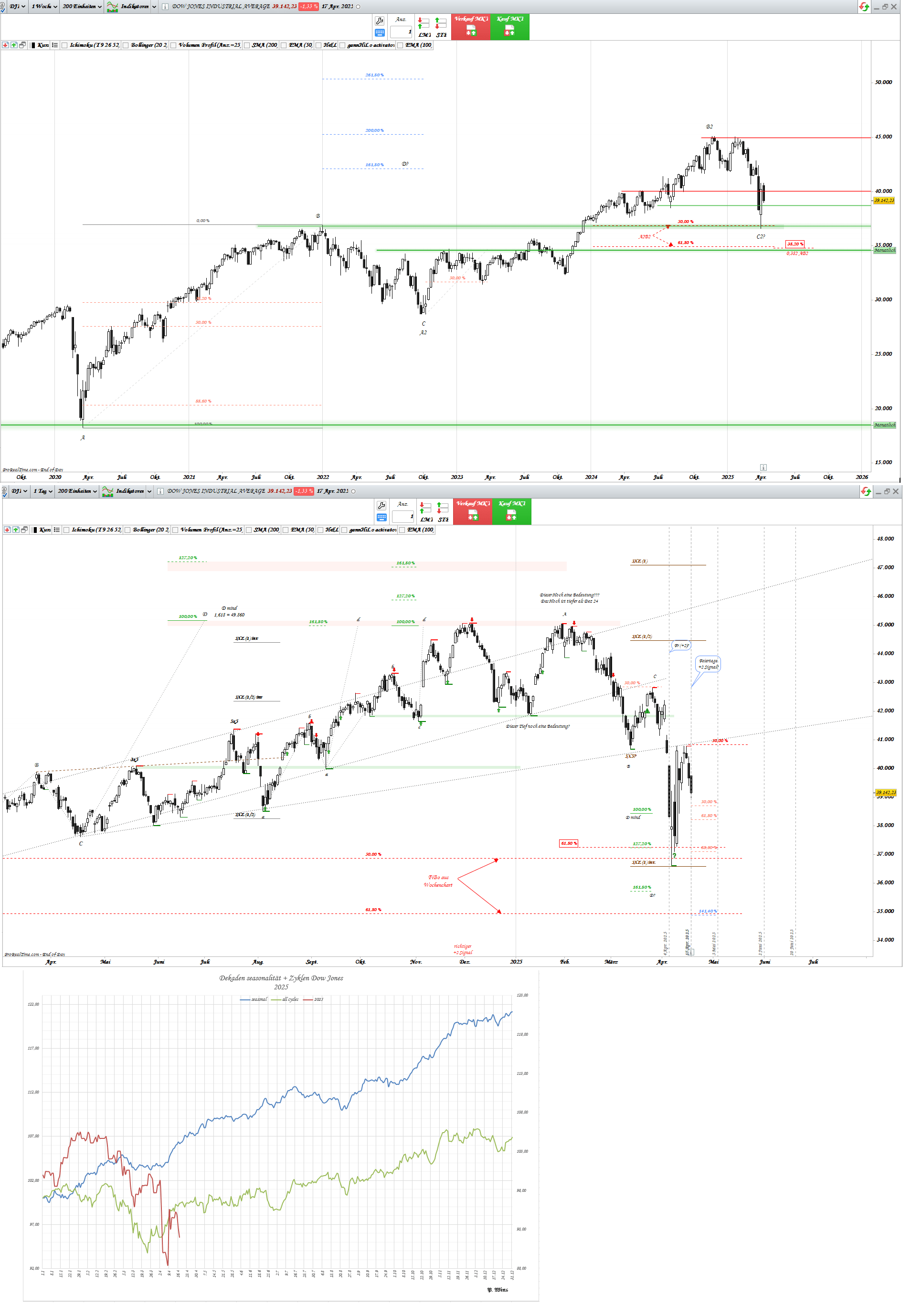 Aber, bevor Dow zu den Zielen schnellen kann, hat er noch paar Hürden zu bewältigen. Vor der ersten steht ja schon: 0,618 FiBo. Dort auch gleichzeitig Widerstand aus den Tiefs Okt. 2024 und Januar 2025. Zudem, gleich zum Wochenbeginn, liegen Signaltage vor: 05.05 und 07.05. Welches Ereignis haben wir am 07.05? => US: Fed-Zinsentscheid.... Na dann schauen wir mal, mit welchem Zeichen kommt Dow aus den Signaltagen raus.