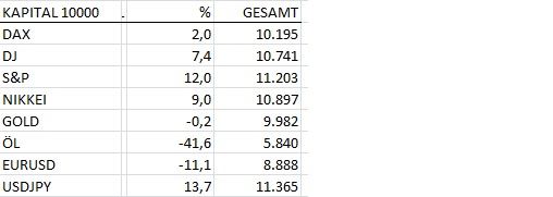 Mittelfristige LongEinstiege via Heydrich, da er v.a. longseitig gut ist. Diesmal war allerdings auch shortseitig einiges zu holen, vorausgesetzt man stieg rechtzeitig wieder aus.... Ausstiege, long&short, dann jedoch nach eigenem System .....