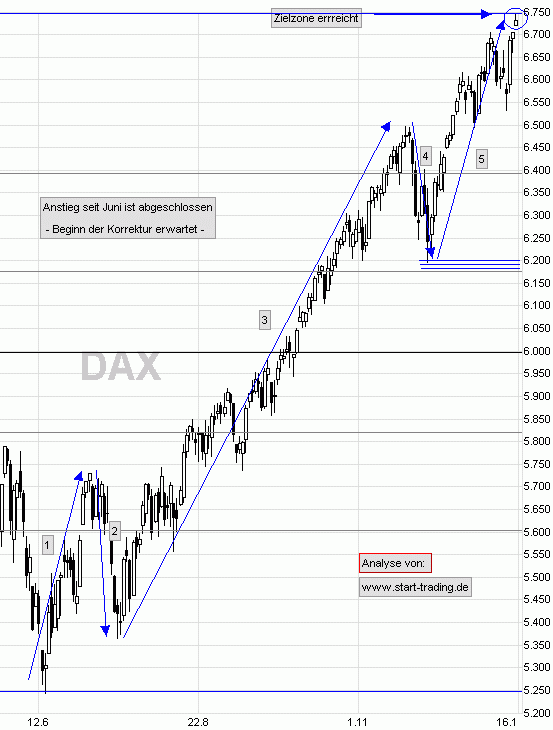 Unsere DAX Analyse sieht den DAX im Endstadium des Anstieges welcher im Juni 2006 begann.