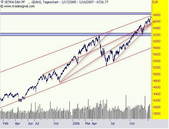 Resultat: Der Anstieg vom Juni 2006 ist komplett und eine Korrektur wird nun beginnen. Mindestziel 6175-6200Punkte.