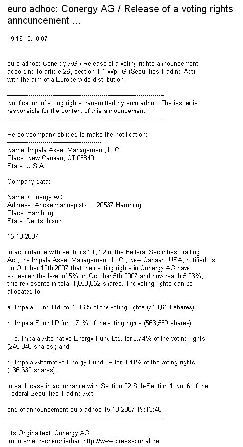 Wien (aktiencheck.de AG) - Die Experten vom "Öko Invest" raten unverändert zum Kauf der Conergy-Aktie (ISIN DE0006040025/ WKN 604002).