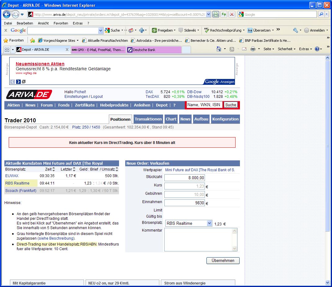 Morgen, am 1.4.2010 wird das Traderspiel neugestartet. Hinzugekommen sind 2 weitere Real-Time-Handelsplätze, DB Realtime und HSBC Realtime. Das orderbasierte Handeln bleibt vorerst an Kursumsätze gebunden, da hier die Eingriffe ins System mehr Arbeitsaufwand benötigen, als momentan investiert werden kann.