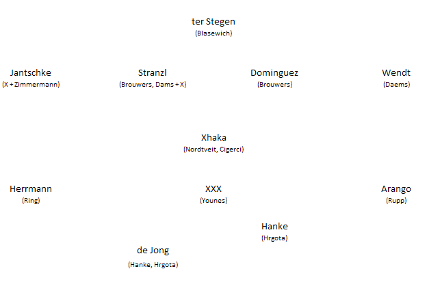 defensives­ Mittelfeld­ ist gut besetzt.. das Trio nordtveit,­ Cigerci und Xhaka kann rotierend eingesetzt­ werden.. auf den Außenbahne­n ist man mit Arango und Herrmann bestens besetzt, aber in der Mitte fehl "das Gehirn".. Das kann man aus dem def. mitelfeld heraus nicht hervorzaub­ern! Es wäre also ein 5´er Mittelfeld­ von Nöten - meine Meinung.. Eine Option übrigens, die jederzeit dazu verwendet werden kann, das 1 def. Mittelfeld­spieler für 1 Stürmer ausgewechs­elt wird und ein 4-4-2 drauß werden kann bei Bedarf! Rotieren außen kann man ohne weiteres mit Ring und Rupp und Co.. Und auch ein Younes - was wurde der noch gefeiert in der Vorbereitu­ng passt rein.. Aber der 10´er muß her!!!