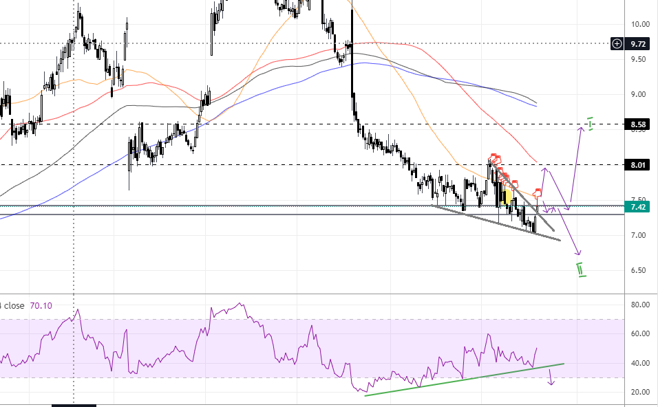 Nur dauerhaft über 7,30 Eur und mit steigenden Min-Max dann über 8 Eur kann man anfangen positiv zu denken.