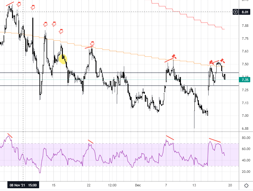 Wie gesagt: Dezember ist kein gutes Mionat, daher die erwartung ist, dass die SMA 50 bleibt als "Deckel", die Bullen werden geschlachtet, der Bereich 7,40-7,30 bleibt Wiederstand, es wird (weit) unten die 7 fallen (Szenario II).
