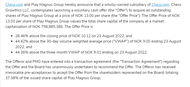 Marktführer chess.com möchte Play Magnus für 13 NOK (ungefähr 1,33 EUR) übernehmen. Es ist jetzt schon das 2. Mal (nach Zendesk - darüber werde ich auch noch etwas schreiben) das ein Unternehmen zu Tiefstkursen weg gekauft werden soll. Eigentlich hat man als Aktionär die Chance bei Kursrückgängen, wenn die Unternehmen fundamental in Ordnung sind, einfach abzuwarten bis sich die Kurse wieder erholen und auf neue Hochs steigen. Werden die Unternehmen einfach weg gekauft, funktioniert das leider nicht.