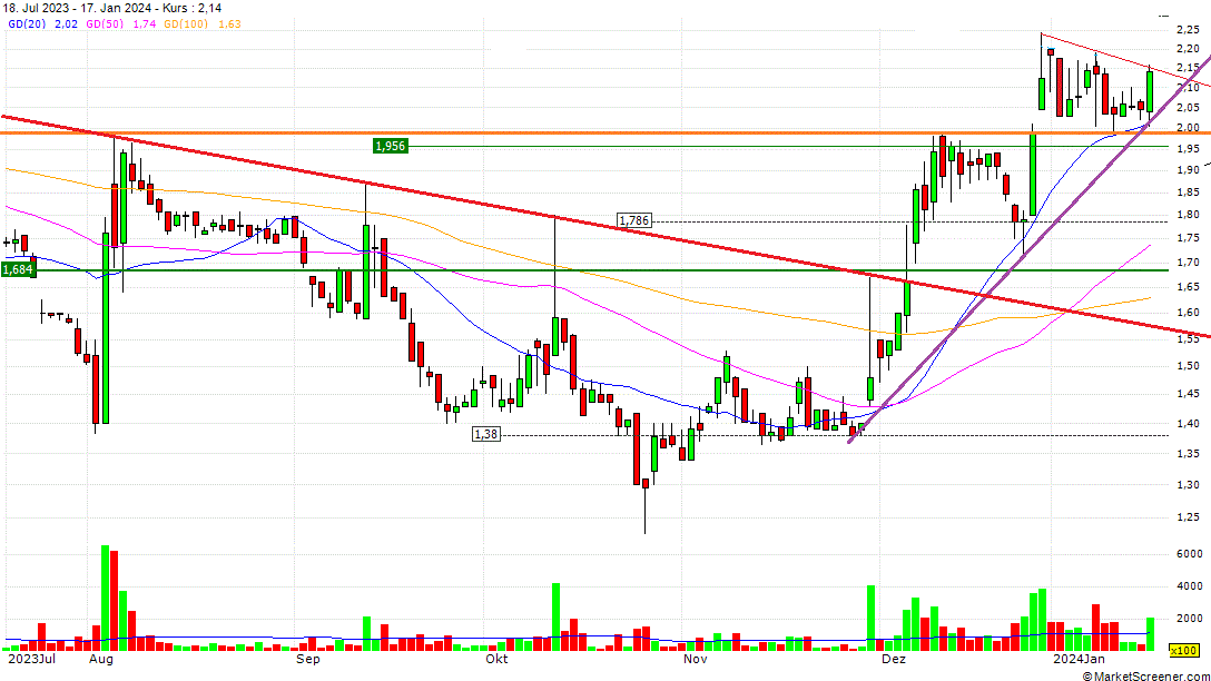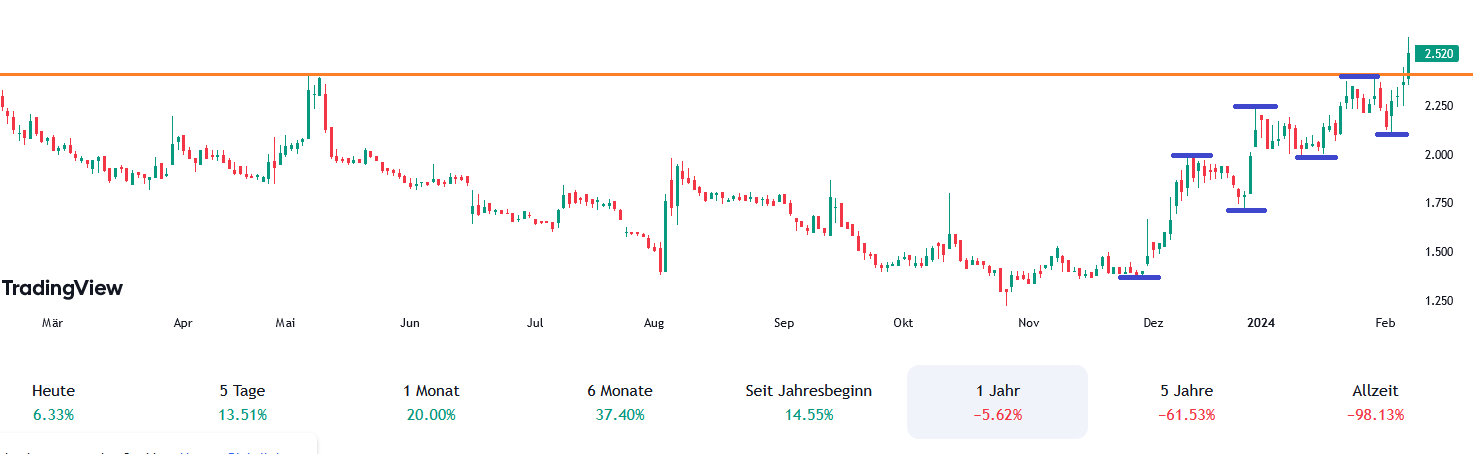 Aktuell erstmal noch weiter Konsolidierung zwischen 1,99 und 2,24 €. Vielleicht war es das heute aber auch schon. Man hat heute gegen den Markt ja enorme Stärke am Nachmittag gezeigt.
