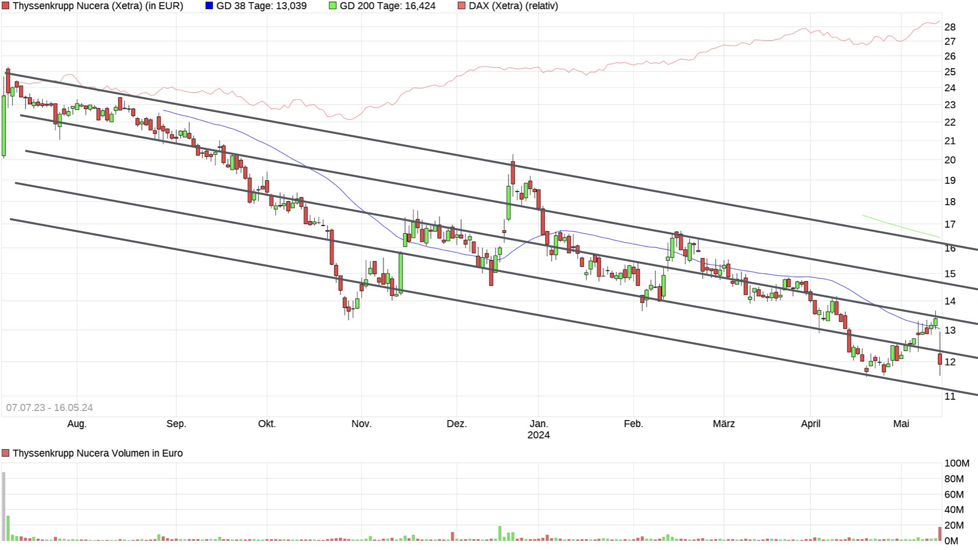 Gestern war es so, dass ich "Nucera 11,00" auf meinen Einkaufszettel eingetragen hab, zunächst ganz intuitiv, und als ich dann den Chart zeichnete, war ich amüsiert, dass er auch genau auf 11 zeigte. Ich betreibe die Mustersuche aber unvoreingenommen.