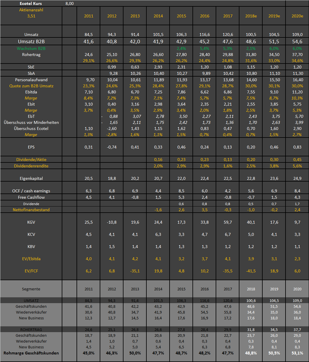 Aber entscheidend für Ecotel ist letztlich wann man im B2B Segment die Marge von 55-60% erzielt. Aktuell tut sich da ja noch gar nichts. Wenn man aber 2020 beispielsweise 55% Marge erzielt, reden wir beim Ebitda etwa von 12 Mio €.