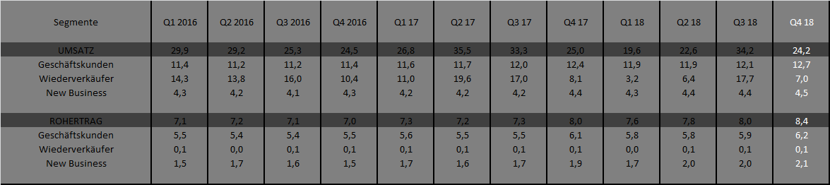 Insgesamt wie zu erwarten war, aber das Wachstum im B2B Segment ist mit knapp 2% etwas enttäuschend. Andererseits ist dafür die Rohmarge für den geringen Umsatz überzeugend, genau wie das Wachstum im Bereich New Business. Das Segment whole Sales kann man wie üblich vernachlässigen und damit auch den Konzernumsatz.