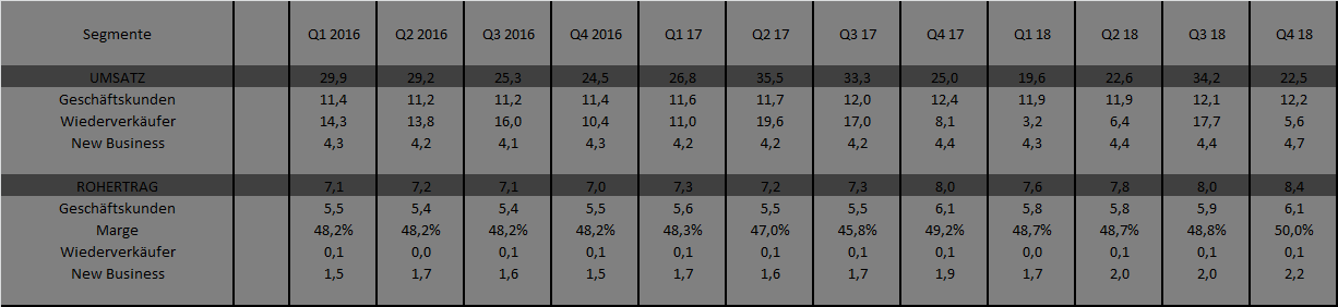 Für die Zahlen, die man 2019 erwarten darf, ist man sicherlich bei den aktuellen 27-28 Mio € MarketCap fair bewertet. Wenn man aber den Vorstandsaussagen zur Skalierung der Gewinne durch den Anstieg der Bruttomarge im B2B Bereich folgt, dann kann man in 2-3 Jahren auch doppelt so hohe MarketCap sehen.