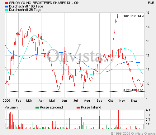 Die Aktienanalysten, die sich zur Zeit mit Senomyx befassen würden seien sich alle einig: Eine Verdoppelung des Aktienkurses im 2006 sollte schon drin sein. Optimisten sähen die Aktie, die heut bei knapp 13 USD notiere, bereits bei 35 USD. Die Risiken seien aber noch erheblich. Das habe gerade die Entwicklung des Aktienkurses gezeigt. Er sei von 22 USD im August dieses Jahres auf 12 USD im November zurückgefallen.