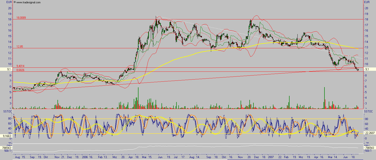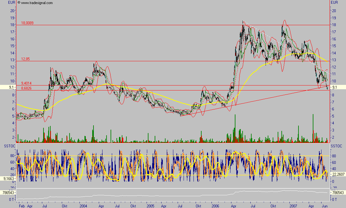 allerdings ist das Volumen insgesamt sehr gering, der Freefloat ist auch nicht besonders üppig, die Delton AG (Quandt-Gruppe) gibt meiner Meinung nach kein Stück ab. Die Aktie hat jetzt 50 % vom ATH verloren, technisch sollte sich bei rnd. 8,70 eine recht massive horizontale Unterstützung befinden, so daß sie gut abzusichern ist. Die Chancen werden höher als die Risiken gesehen, großer Chart muss sein