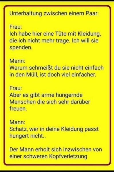 „Oh danke, Liebster. Übrigens, auf dem Weg hierher habe ich beim Mercedes-Autohaus das neueste Coupé gesehen. Weißt du, Lederinterieur, metallisierter Lack, full optional … Nur 150.000 Euro. Ich will ja nicht von deiner Güte profitieren aber was meinst du dazu?“ „Na ja, wenn es so ist, kauf es!“