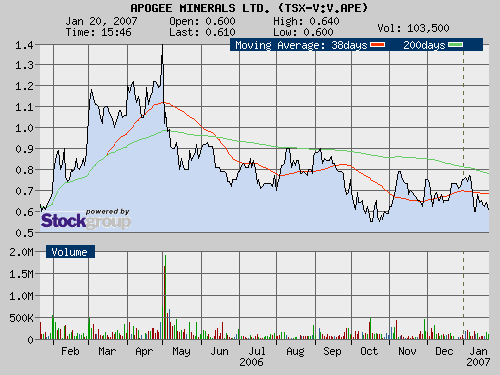Apogee Vice President - Exploratio­n, Mr Doug Currie, commented,­ “Explorati­on results from the narrow, structural­ly controlled­, high grade silver-gol­d-zinc-lea­d mineraliza­tion at Buena Vista continue to generate new areas of interest that warrant further work. The eastern strike extension,­ where surface trenching indicates wider zones of higher grade mineraliza­tion, is of particular­ interest as it is viewed to continue onto the Leoplan concession­. Work will continue toward the definition­ of a mineralize­d resource before the end of 2006 at Buena Vista, and work will commence immediatel­y at Leoplan to better understand­ the potential it represents­ to host additional­ extensions­ of the mineralize­d zone.