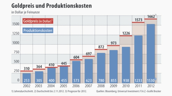 da liegt ja MMY extrem weit drunter mit den Produktionskosten. Aber da könnte man ja auch was andere herauslesen. Der Goldpreis steigt nicht nur wegen der Unsicherheit der Zukunft sondern auch, weil die Produktionskosten ansteigen. Wenn man direkt in Gold anlegen will wäre das eine sehr interessante Überlegung, dass der Goldpreis für 2011 nie unter 1233€ fallen dürfte, da sonst der Durchschnitt mit der Produktion Geld verbrennt.