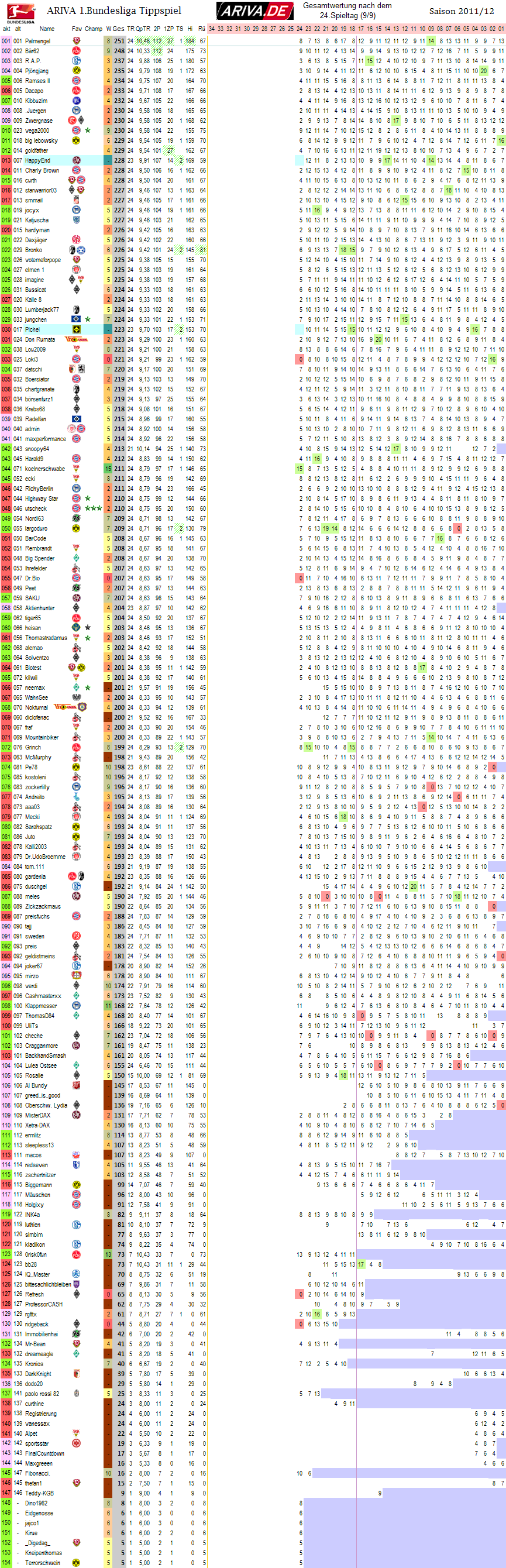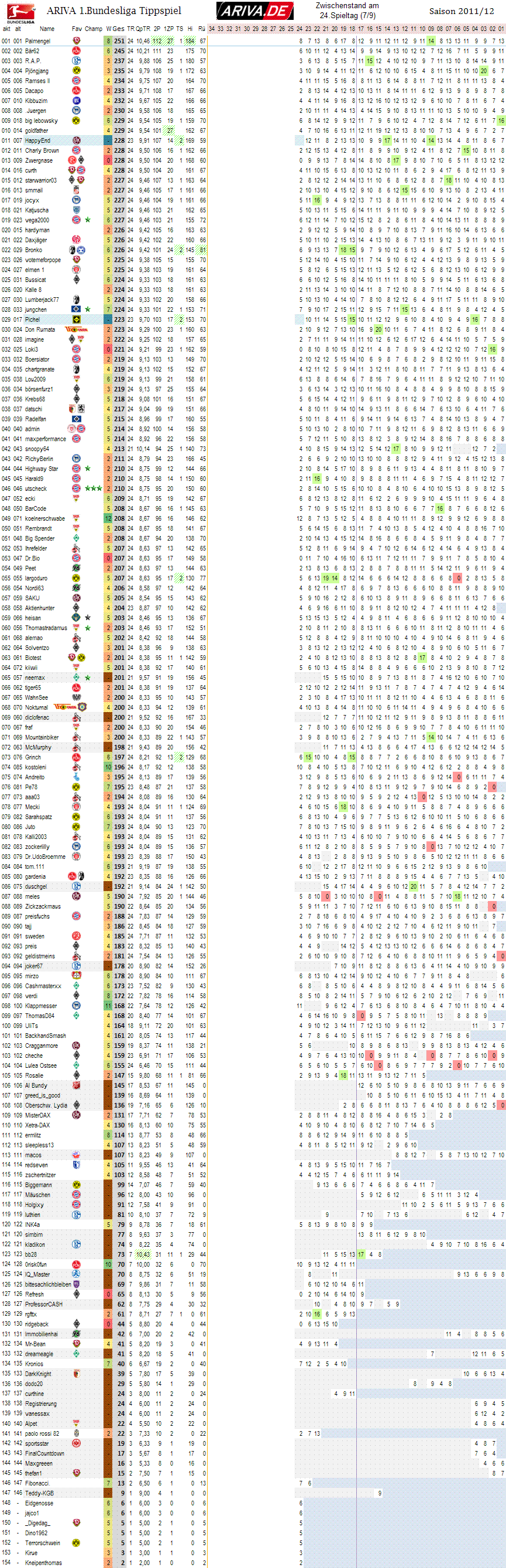 Palmengel hat den besten Schnitt pro Tipprunde.. hat die meisten richtigen Tendenzen, neben Bär62, mit 112.. Palmengel hat gar die meisten Extrapunkte, neben goldfather mit je 27.. und hatte die beste Hinrunde.. Uff..