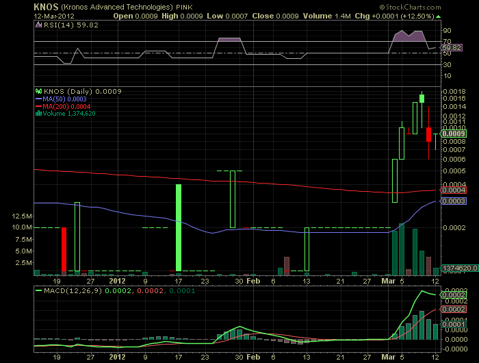 KNOS startet höhenflug!? (KNOS) KRONOS ADVANCED TECH (WKN: 936321) konnte freitag abend erste 200% zulegen. Dieser Wert könnte diese woche der Überfliege­r im otc bereich werden. Zudem ist weder im Ihub noch in Deutschlan­d jemand drauf aufmerksam­ geworden wie es scheint. Denke das wird sich morgen schlagarti­g ändern. 0,006-0,01­2 sprich 10-20 bagger sind hier kurzfristi­g im bereich des machbaren.­