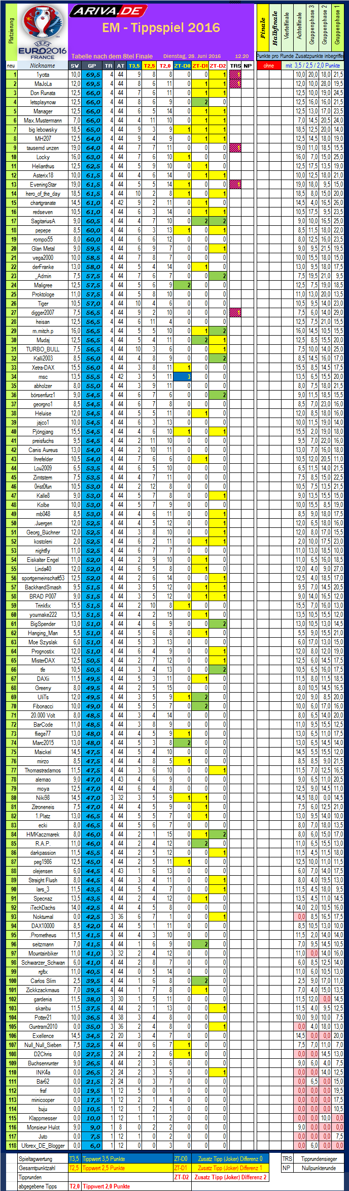 28 Punkte bleiben zu vergeben, also absolute Spannung ist angesagt. Was die Zusatzpunkte anbetrifft möchte ich aber auch noch auf "msc" eingehen, der bisher 3 Mal die korrekte Anzahl der Tore pro Runde getippt hat. Einmal musste er auf die Punkte in dieser Wertung verzichten, weil er etwas zu spät getippt hatte (10 Spiele)