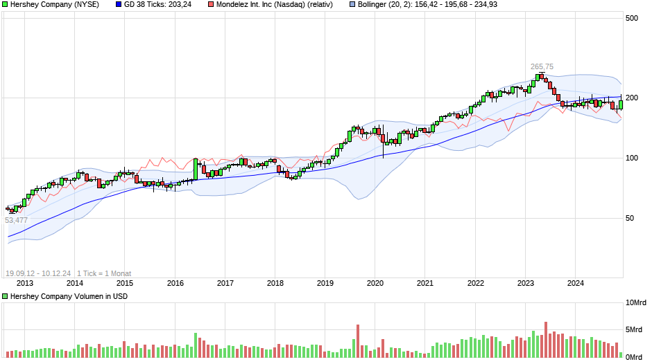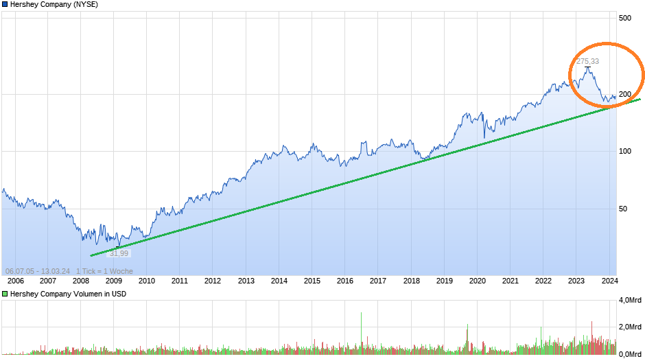 Zum Profil (Quelle Ariva): "The Hershey Company ist ein führender US-amerikanischer Süßwarenkonzern. Zu den Kernkompetenzen gehören die Herstellung, die Vermarktung und der Verkauf von Schokolade, schokoladehaltigen Lebensmitteln und anderen Süßigkeiten. Die Produkte werden unter verschiedenen Markennamen auf den Markt gebracht. Zu den bekanntesten Produktlinien gehören unter anderem Hershey's, KitKat, Reese's, Rolo, Pot of Gold, Almond Joy und Cadbury."