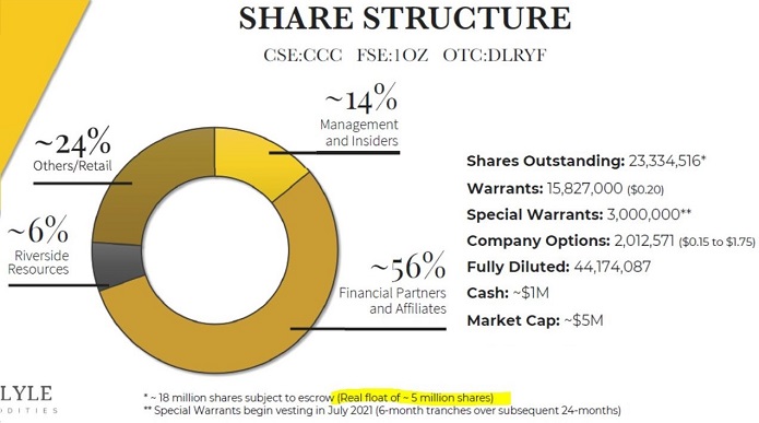 1) Nur rund 5,6 Mio. Aktien oder 24% aller Aktien im Free-Float. Alle anderen Aktien in Händen von Management, Insidern, Finanzpartnern und Riverside Resources