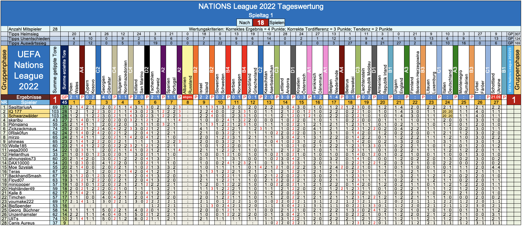So macht das Tippen auf die NATIONS League ja doch gleich noch viel mehr Spaß ! - Wer wird unser glücklicher Gewinner der aktuellen Saison 2022/23 ? - Das wissma ja noch laaaaange nicht, aber mit dem fröhlichern Tippen geht's jetzt flott weiter dort: